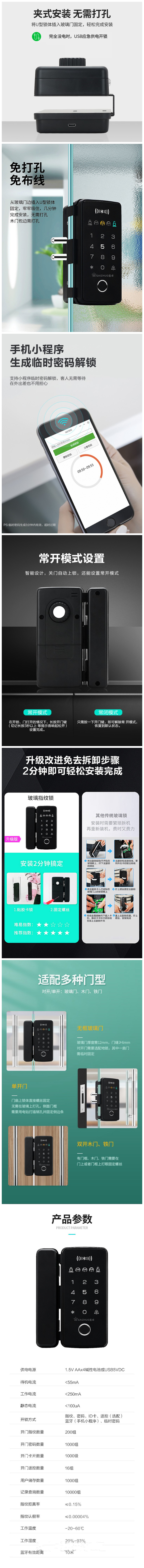 免布线,免开孔玻璃门指纹锁808